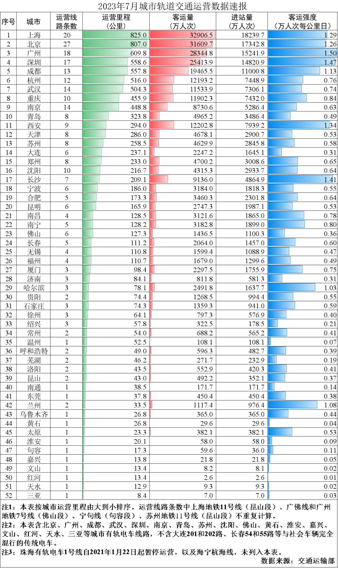 2023年7月,31个省(自治区、直辖市)和新疆生产建设兵团共有54个城市开通运营城市轨道交通线路296条,运营里程9743.5公里,实际开行列车324万列次,完成客运量26.6亿人次,进站量16亿人次。7月份,客运量环比增加2.2亿人次、增长9.2%,同比增加7.1亿人次、增长36.4%,较2019年月均客运量增加6.7亿人次、增长33.8%。7月份客运强度平均水平为0.546万人次每公里日,与2019年全年客运强度平均水平持平。