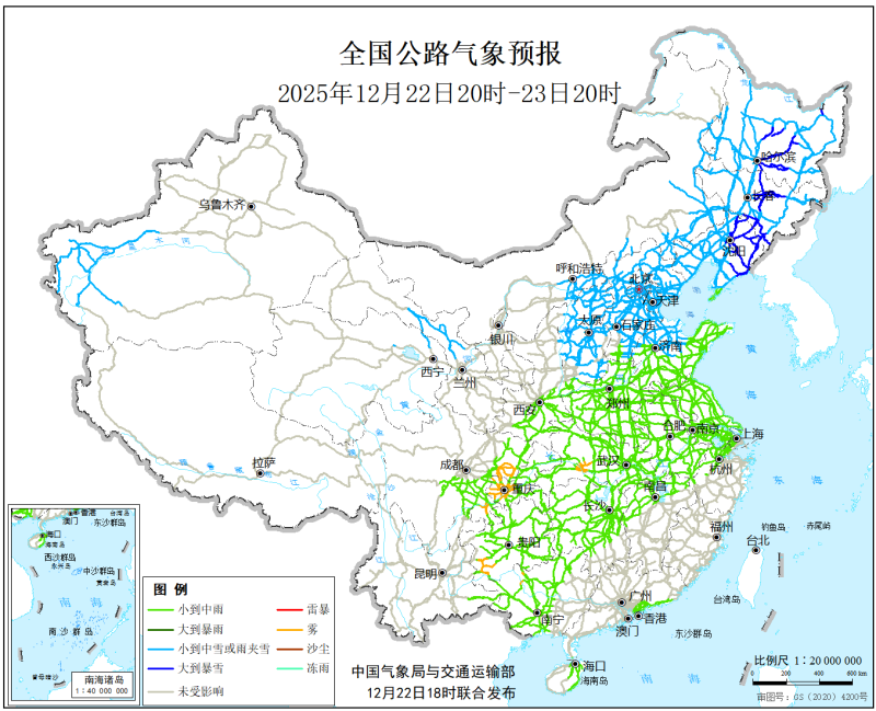 中国气象局与交通运输部2025年12月22日联合发布全国主要公路气象预报