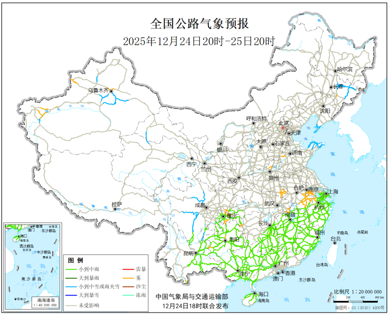 中国气象局与交通运输部2025年12月24日联合发布全国主要公路气象预报