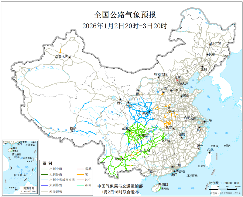 中国气象局与交通运输部2026年1月2日联合发布全国主要公路气象预报