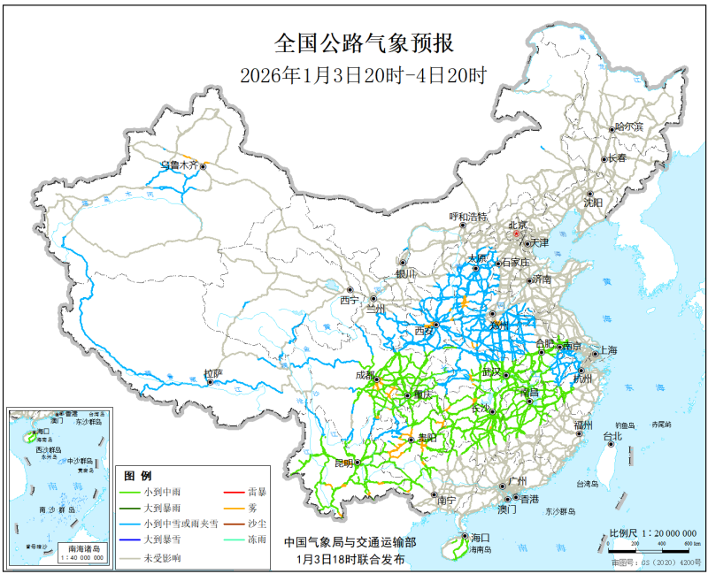 中国气象局与交通运输部2026年1月3日联合发布全国主要公路气象预报