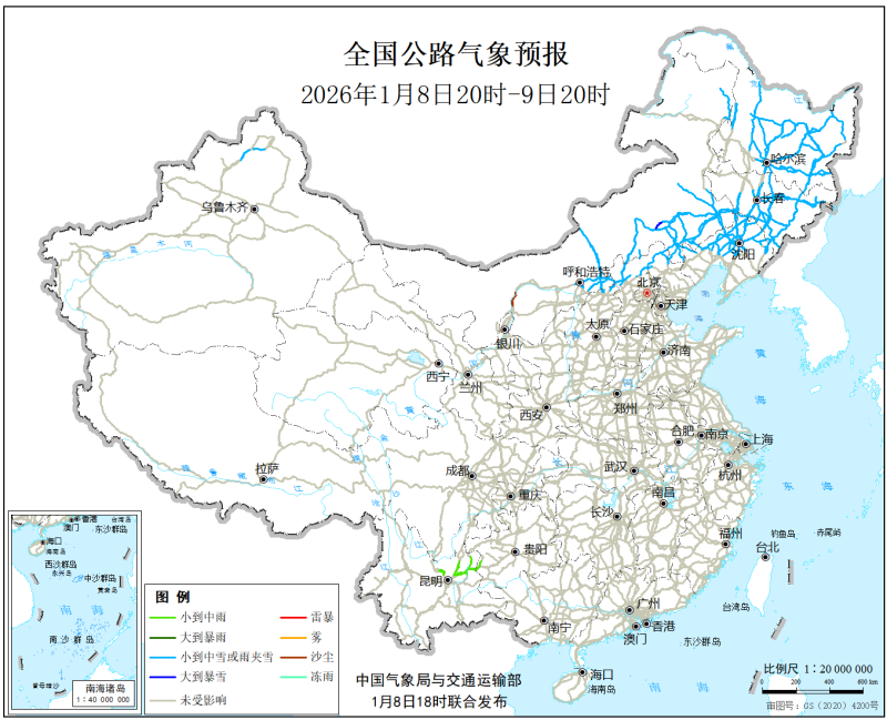 中国气象局与交通运输部2026年1月8日联合发布全国主要公路气象预报