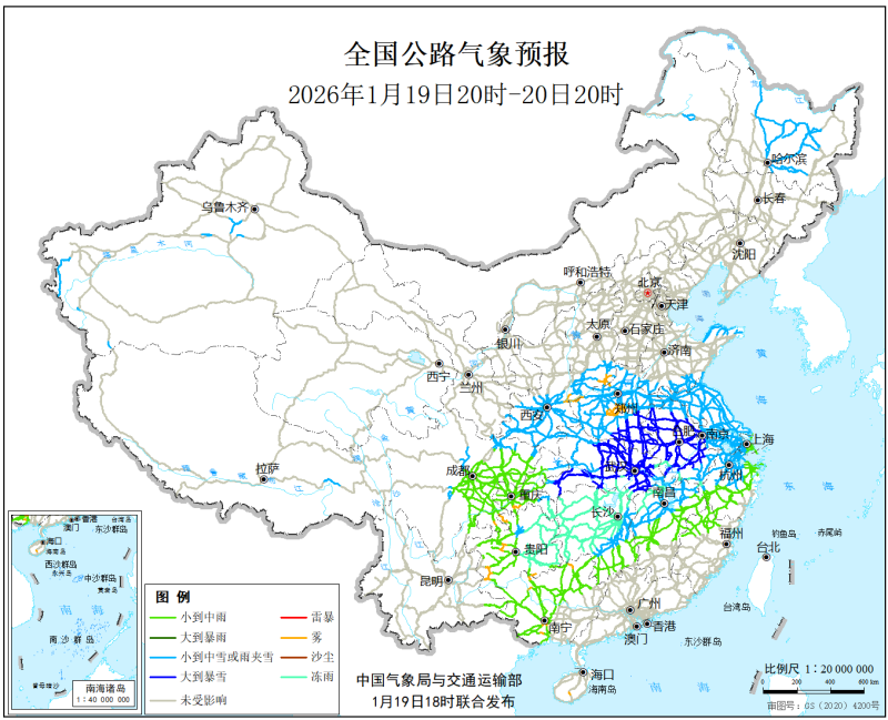 中国气象局与交通运输部2026年1月19日联合发布全国主要公路气象预报