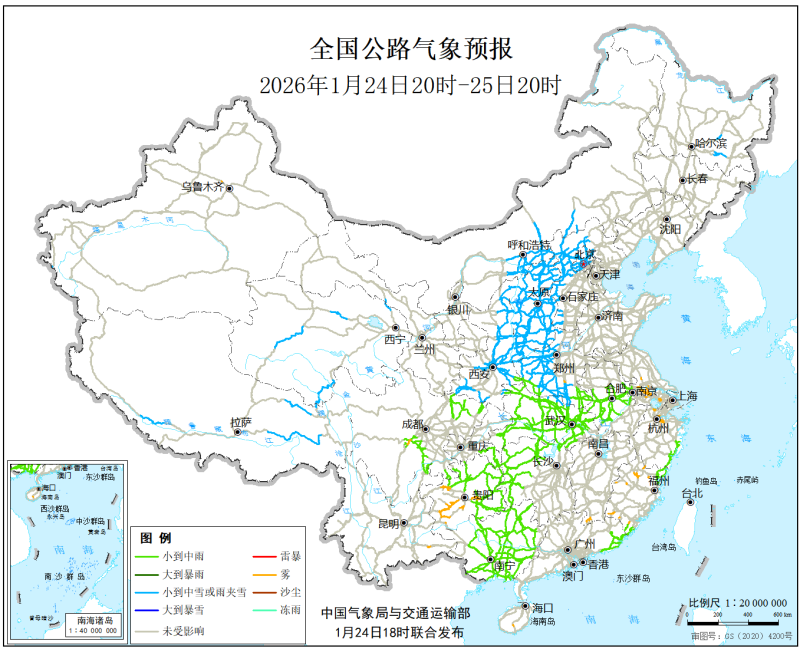 中国气象局与交通运输部2026年1月24日联合发布全国主要公路气象预报