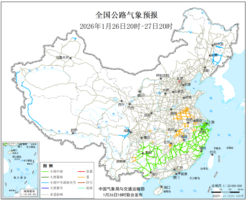 中国气象局与交通运输部2026年1月26日联合发布全国主要公路气象预报