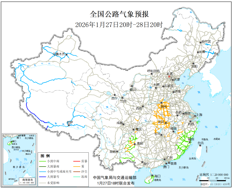 中国气象局与交通运输部2026年1月27日联合发布全国主要公路气象预报