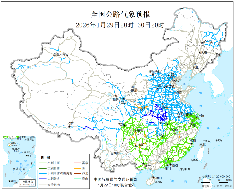 中国气象局与交通运输部2026年1月29日联合发布全国主要公路气象预报