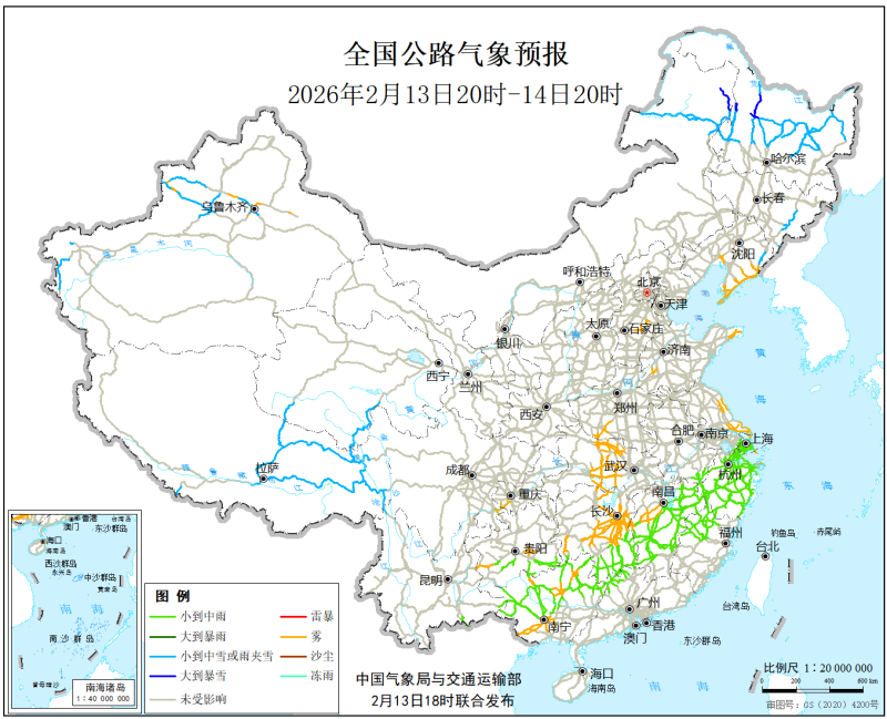 中国气象局与交通运输部2026年2月13日联合发布全国主要公路气象预报