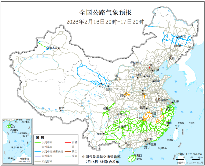 中国气象局与交通运输部2026年2月16日联合发布全国主要公路气象预报
