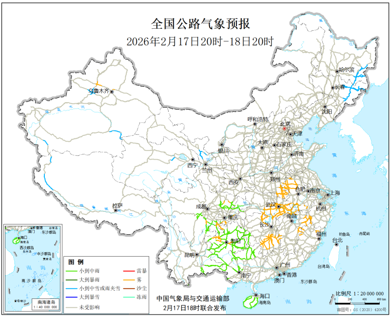 中国气象局与交通运输部2026年2月17日联合发布全国主要公路气象预报
