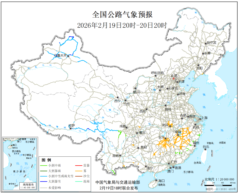 中国气象局与交通运输部2026年2月19日联合发布全国主要公路气象预报