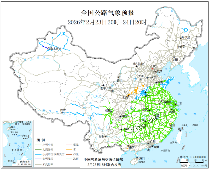 中国气象局与交通运输部2026年2月23日联合发布全国主要公路气象预报