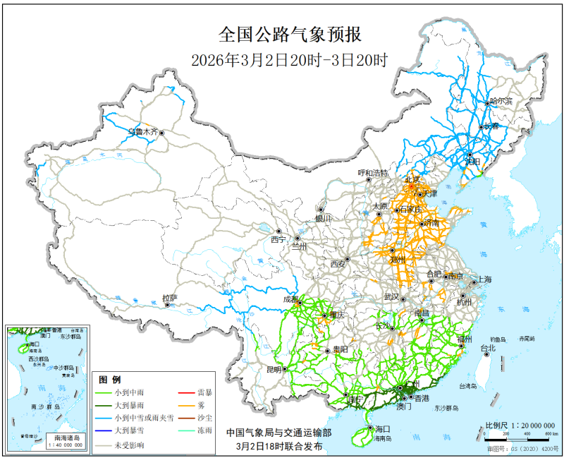 中国气象局与交通运输部2026年3月2日联合发布全国主要公路气象预报