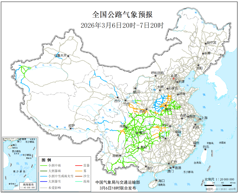 中国气象局与交通运输部2026年3月6日联合发布全国主要公路气象预报