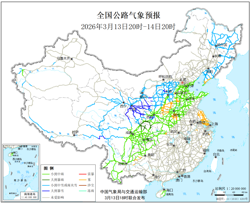 中国气象局与交通运输部2026年3月13日联合发布全国主要公路气象预报