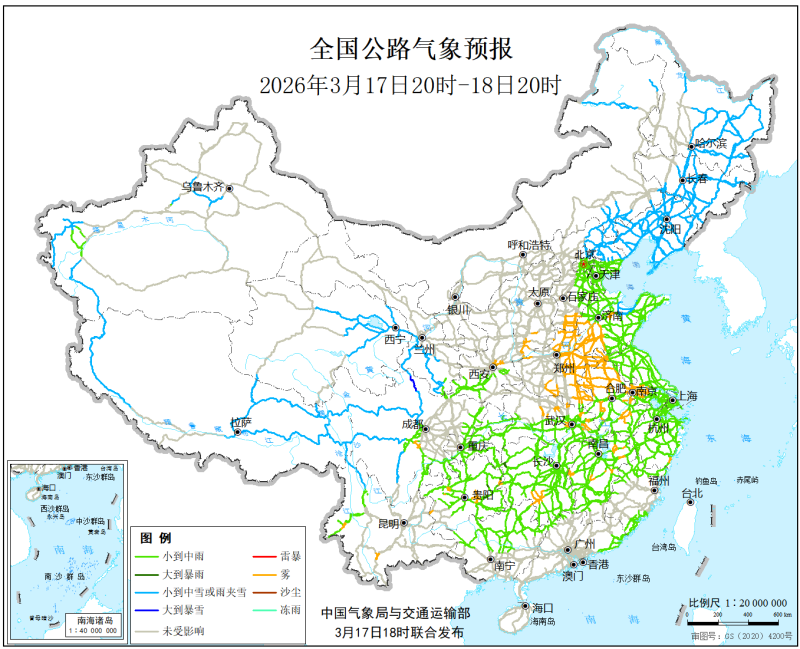 中国气象局与交通运输部2026年3月17日联合发布全国主要公路气象预报