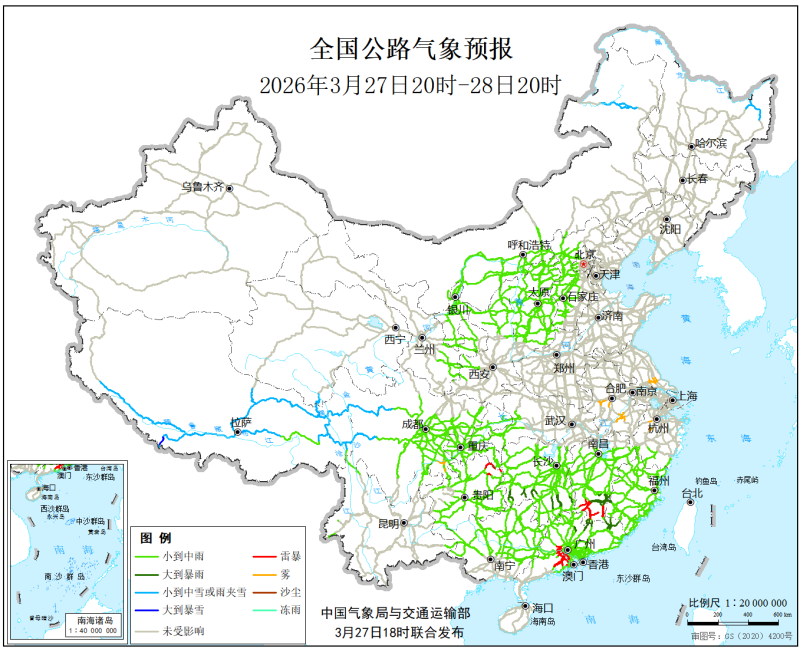 中国气象局与交通运输部2026年3月27日联合发布全国主要公路气象预报
