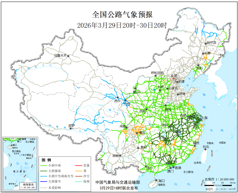 中国气象局与交通运输部2026年3月29日联合发布全国主要公路气象预报