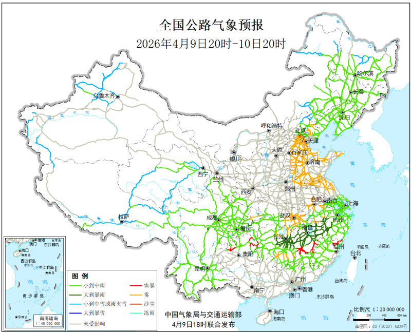 中国气象局与交通运输部2026年4月9日联合发布全国主要公路气象预报