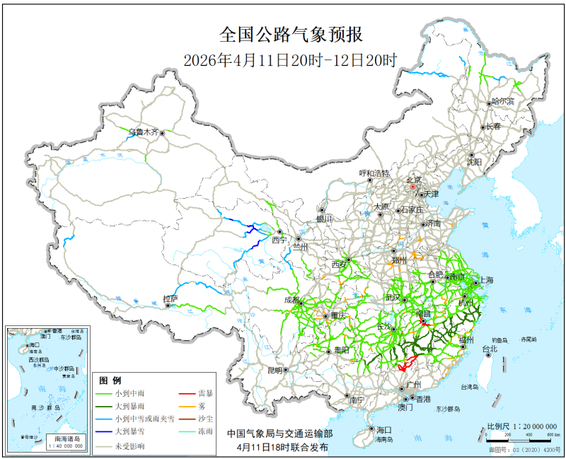 中国气象局与交通运输部2026年4月11日联合发布全国主要公路气象预报