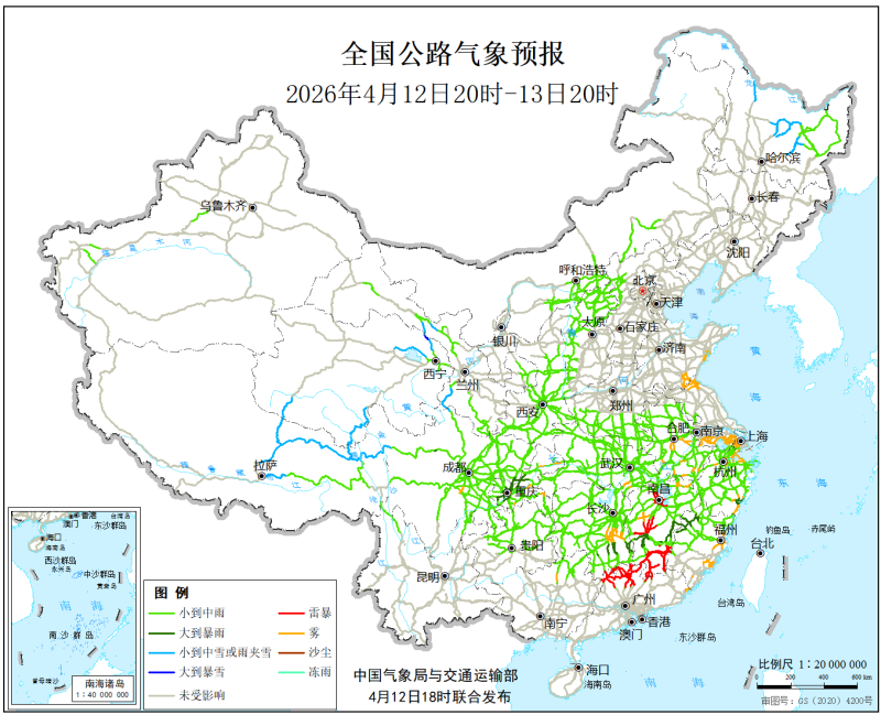 中国气象局与交通运输部2026年4月12日联合发布全国主要公路气象预报