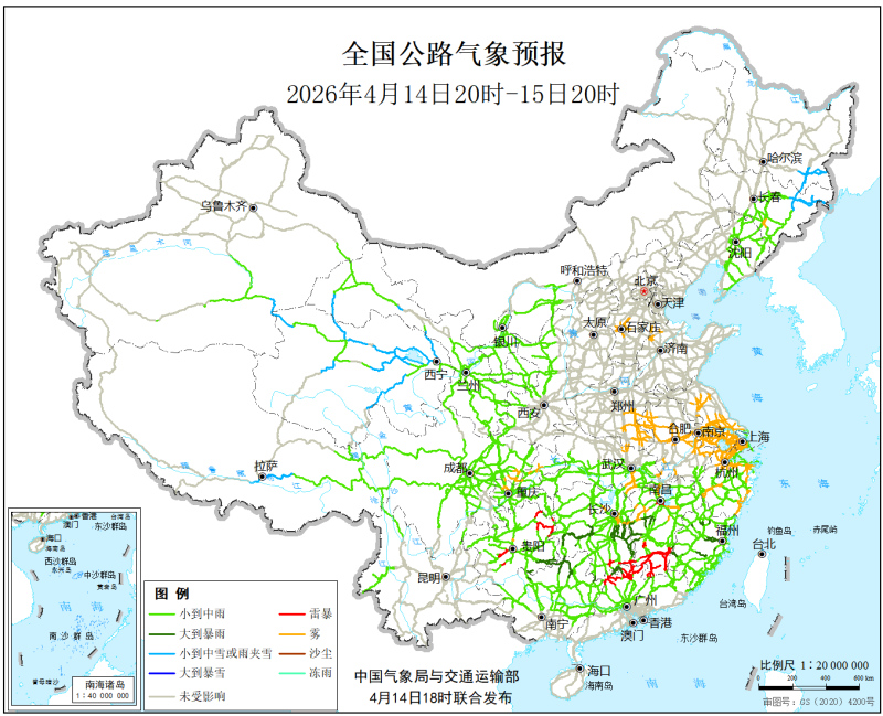 中国气象局与交通运输部2026年4月14日联合发布全国主要公路气象预报