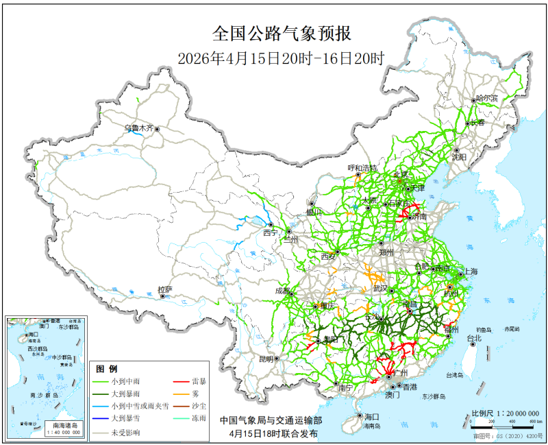 中国气象局与交通运输部2026年4月15日联合发布全国主要公路气象预报