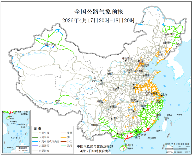 中国气象局与交通运输部2026年4月17日联合发布全国主要公路气象预报