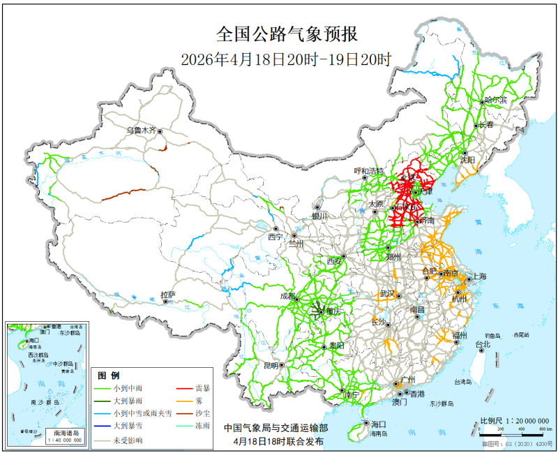 中国气象局与交通运输部2026年4月18日联合发布全国主要公路气象预报