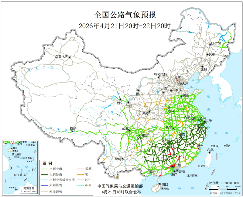 中国气象局与交通运输部2026年4月21日联合发布全国主要公路气象预报