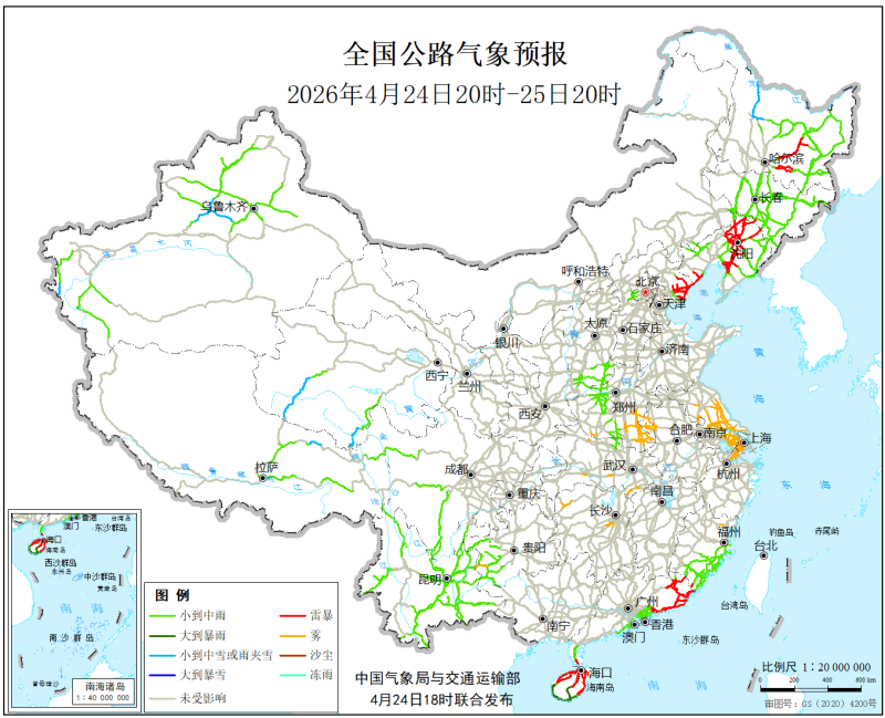 中国气象局与交通运输部2026年4月24日联合发布全国主要公路气象预报