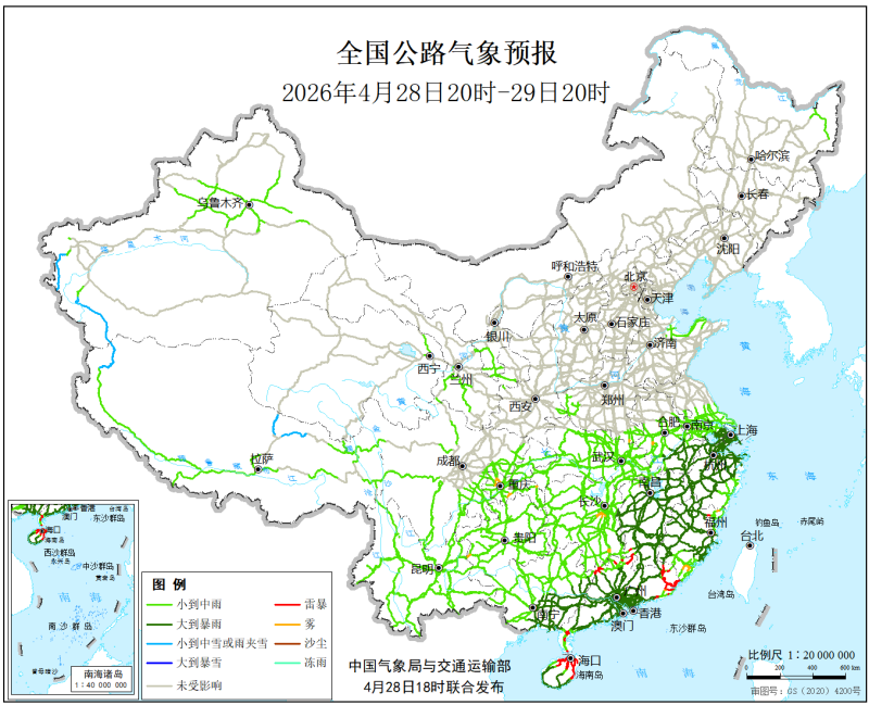 中国气象局与交通运输部2026年4月28日联合发布全国主要公路气象预报