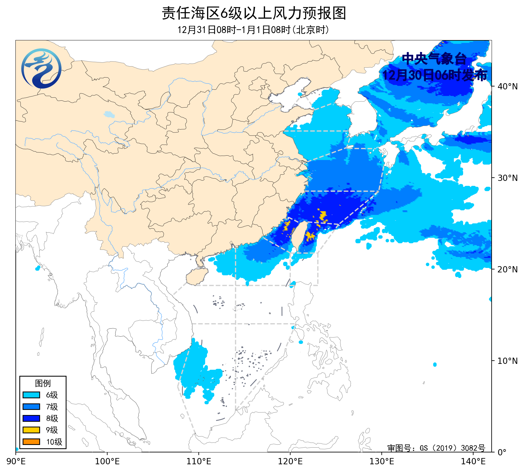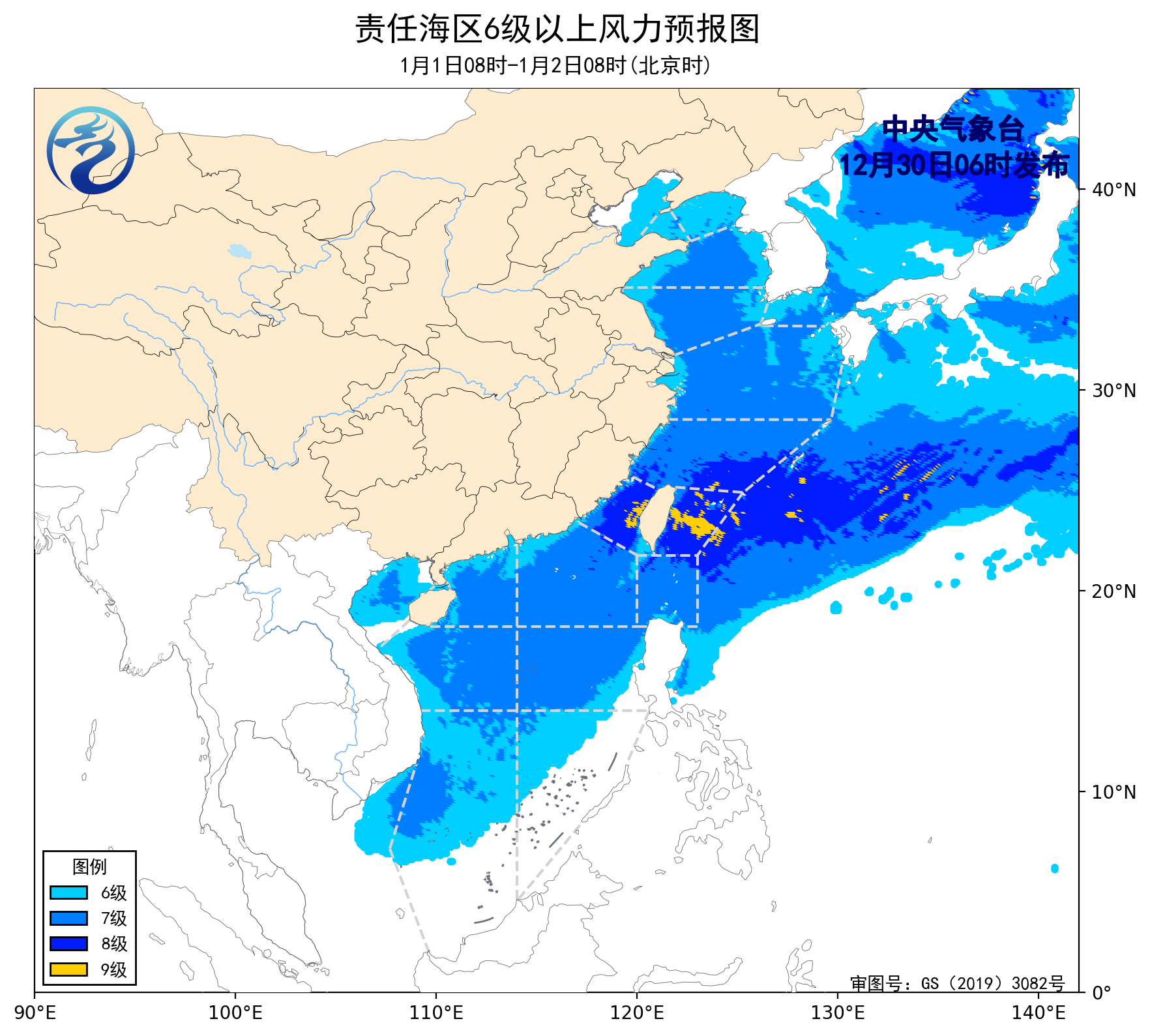 12月31日08时至1月1日08时,东海南部海域、台湾海峡、台湾以东洋面将有6~8级、阵风9级的偏北到东北风,东海北部海域、南海东北部海域将有5~7级、阵风8级的东北风,黄海大部海域、巴士海峡、南海西南部海域将有4~6级、阵风7级的偏北到东北风,南海西北部海域将有4~6级、阵风7级的偏东到东北风。