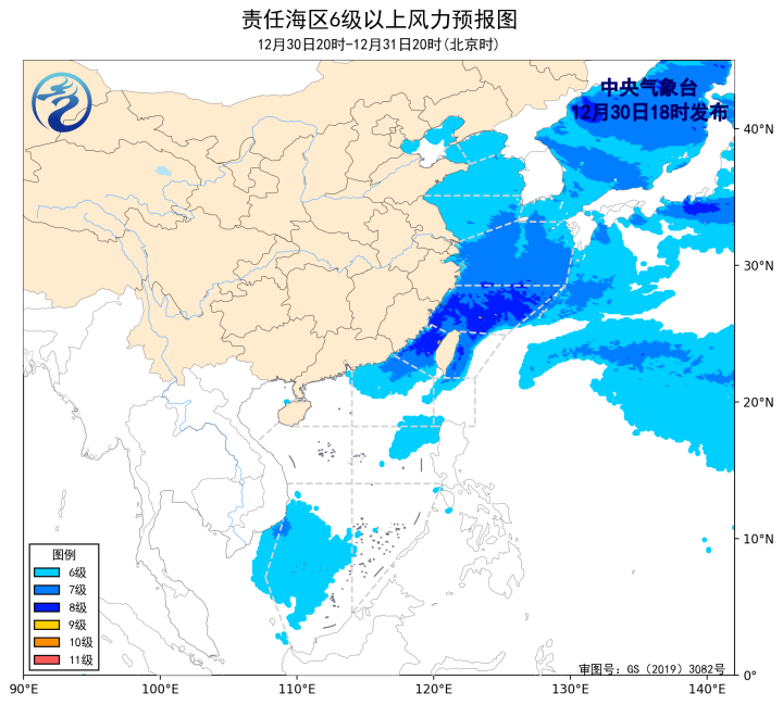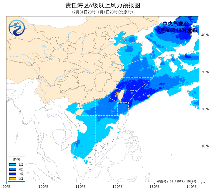 12月31日20时至1月1日20时,黄海大部海域、东海北部海域、巴士海峡、南海北部和中部海域将有6~7级、阵风8级的偏北风,东海南部海域、台湾海峡、台湾以东洋面将有7~8级、阵风9~10级的偏北到东北风,其中台湾海峡部分海域风力可达9级、阵风10~11级,渤海、渤海海峡将有4~6级、阵风7级的西北风到偏北风,南海南部海域将有4~6级、阵风7级的偏北到东北风,北部湾、琼州海峡将有4~6级、阵风7级的偏东到东北风。
