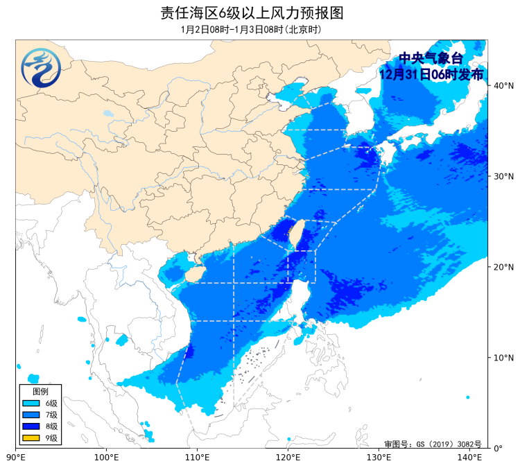 12月31日08时至1月1日08时,东海大部海域、台湾海峡、台湾以东洋面、南海东北部海域将有6~8级、阵风9级的东北风,巴士海峡将有5~7级、阵风8级的偏北到东北风,渤海海峡、黄海北部和中部海域将有4~6级、阵风7级的偏北到西北风,黄海南部海域、南海西北部和西南部海域将5~7级、阵风8级的偏北到东北风。