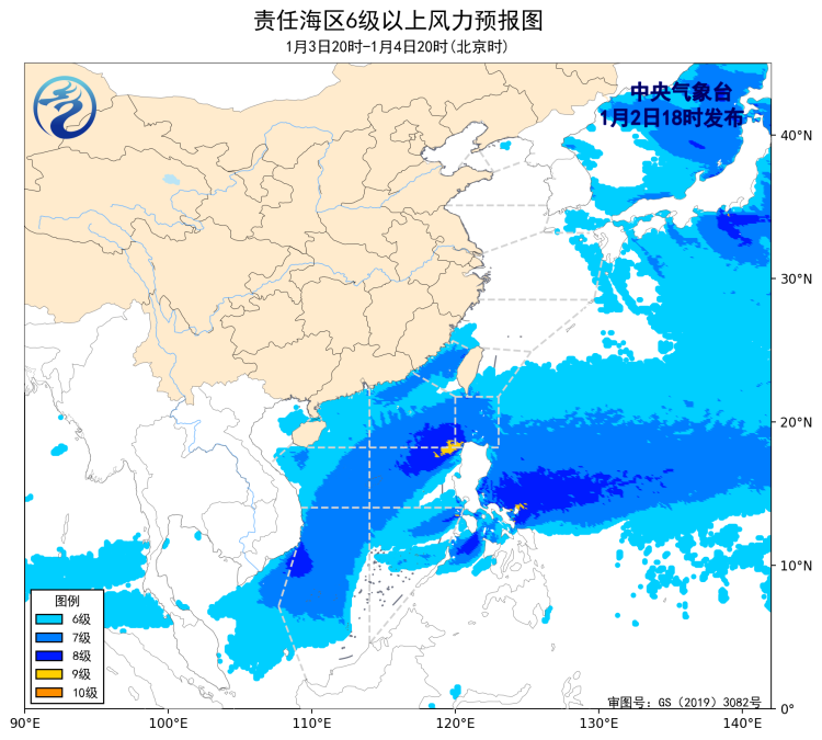 3日20时至4日20时,台湾海峡、台湾以东洋面、巴士海峡、南海大部海域将有6~8级、阵风9级的大风,其中南海东北部和中东部、巴士海峡部分海域风力可达9级、阵风10级。