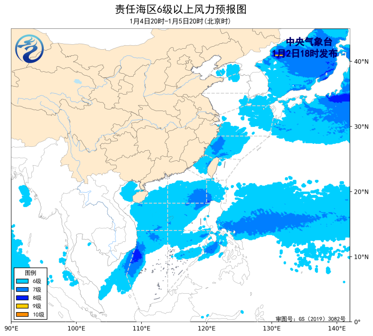 4日20时至5日20时,巴士海峡、南海大部海域将有5~7级、阵风8级的偏东到东北风,东海大部海域、台湾海峡将有5~7级、阵风8级的风,渤海海峡、黄海北部海域将有4~6级、阵风7级的偏北到东北风,北部湾、琼州海峡将有4~6级、阵风7级的偏东风或东北风。