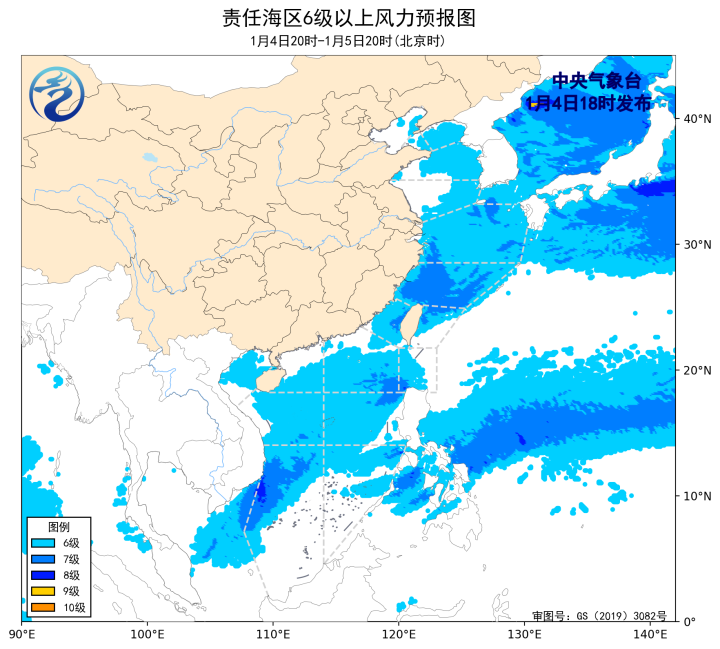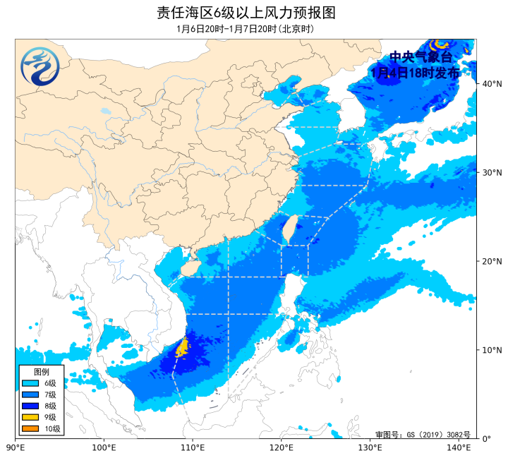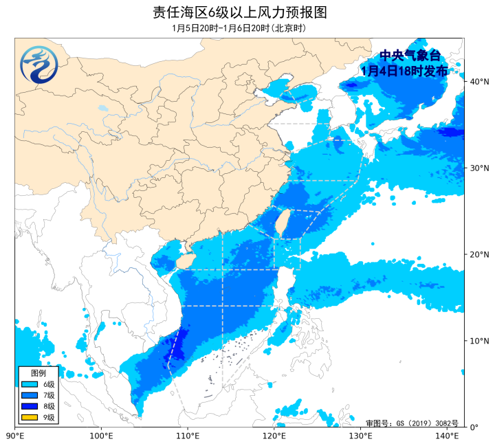1月4日02时至14时,台湾海峡、南海西南部海域出现了5~7级、阵风8级的偏北风,巴士海峡、南海北部海域、南海中西部海域、南海东南部海域出现了5~7级、阵风8级的东北风或偏东风。
