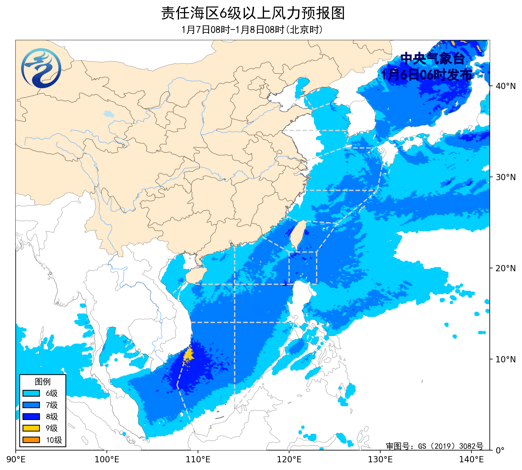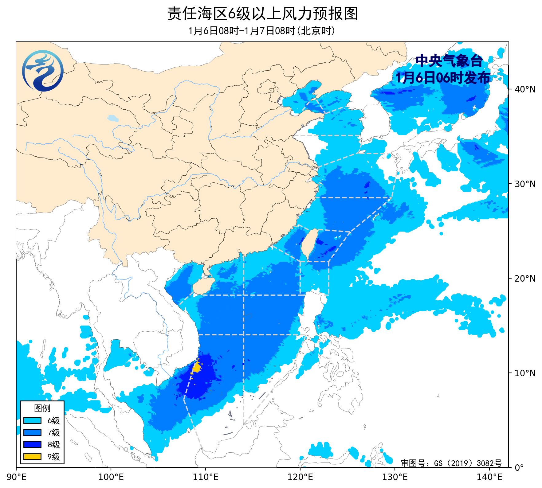 6日08时至7日08时,南海西南部海域将有7~8级、阵风9级的东北风,渤海将有5~7级、阵风8级的偏西转偏北风,渤海海峡、东海大部海域将有5~7级、阵风8级的偏北到西北风,台湾海峡、台湾以东洋面、巴士海峡、北部湾、南海东部、西北部和南海中西部海域将有5~7级、阵风8级的偏北到东北风,黄海北部海域将有5~6级、阵风7级的偏西转偏北风,黄海中部和南部海域将有4~6级、阵风7级的偏西到西北风,琼州海峡将有4~6级、阵风7级的东北风。
