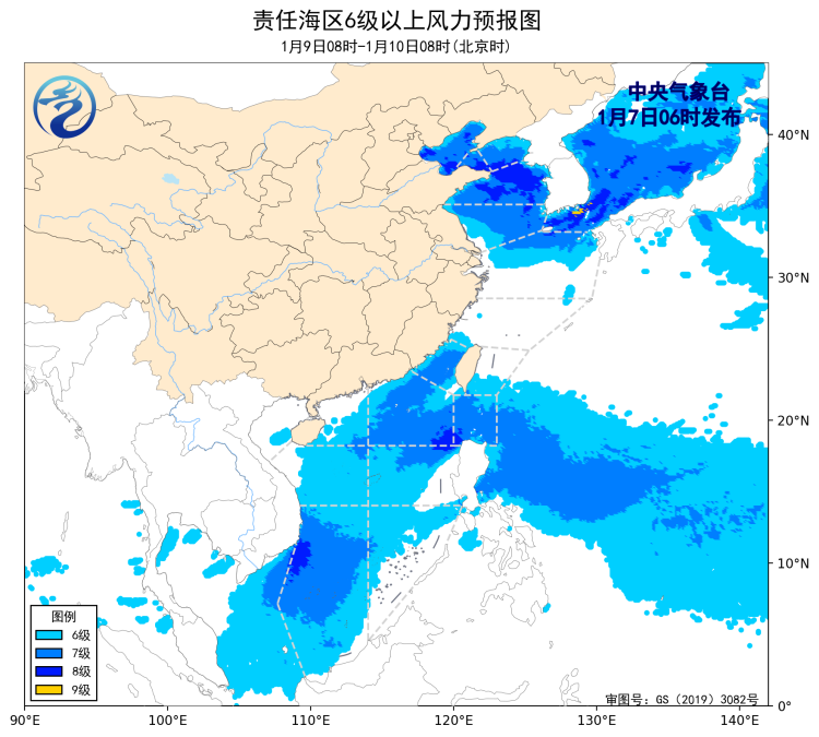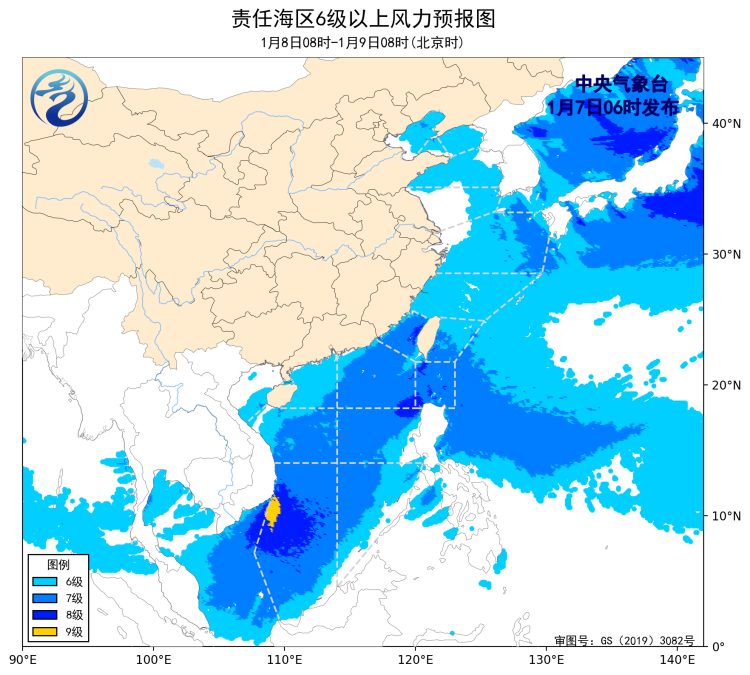 1月6日14时至7日02时,渤海、东海大部海域、台湾以东洋面、南海东北部海域、南海南部海域出现了6~8级、阵风9级的偏北风或西北风,黄海北部和南部海域、台湾海峡、南海西部海域出现了5~6级、阵风7级的偏北风或西北风,黄海中部海域出现了5~6级、阵风7级的偏西风,巴士海峡、北部湾出现了5~6级、阵风7级的东北风。