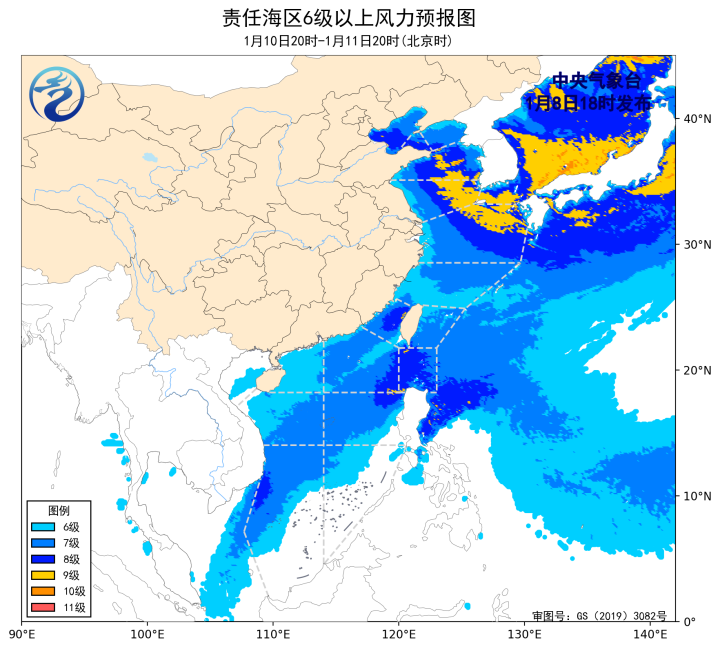 10日20时至11日20时,渤海、渤海海峡、黄海大部海域、东海大部海域、台湾海峡、巴士海峡、台湾以东洋面、南海大部海域将有6~8级、阵风9级的大风,其中黄海中东部和东南部、东海东北部的部分海域风力可达9级、阵风10级。