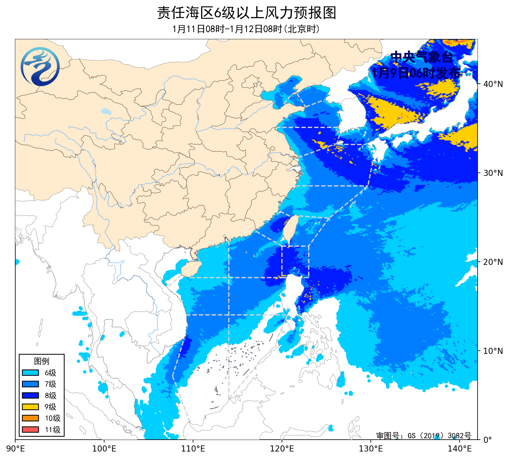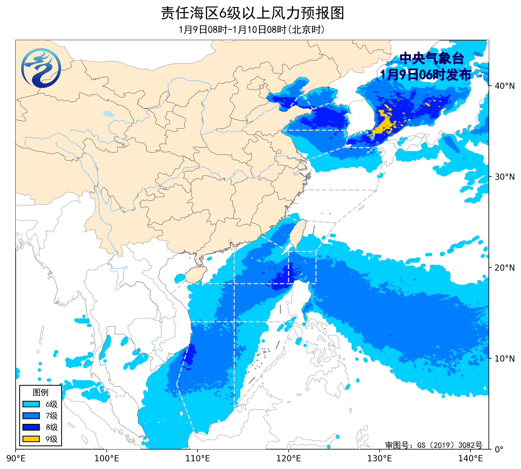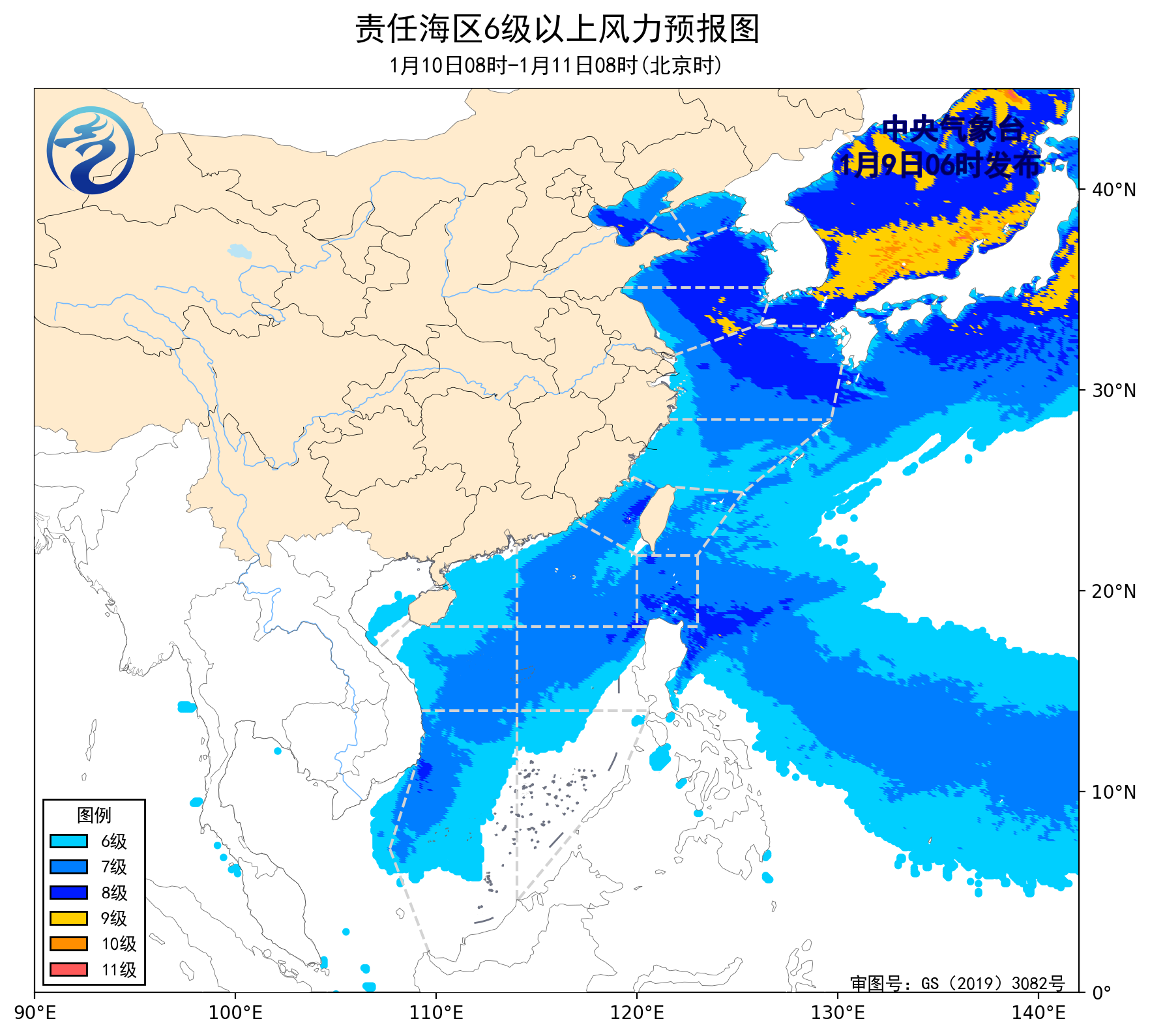 10日08时至11日08时,黄海中部和南部海域、东海北部海域将有6~8级、阵风9级的偏西到西北风,台湾以东洋面将有4~5级增大到6~7级、阵风8级的东北风,渤海、渤海海峡、黄海北部海域将有6~7级、阵风8级的偏西到西北风,东海南部海域、台湾海峡、南海中部、东北部和南海西南部海域将有5~7级、阵风8级的偏北到东北风,巴士海峡将有6~7级、阵风8级的偏东到东北风,南海西北部海域将有5~6级、阵风7级的东北风。