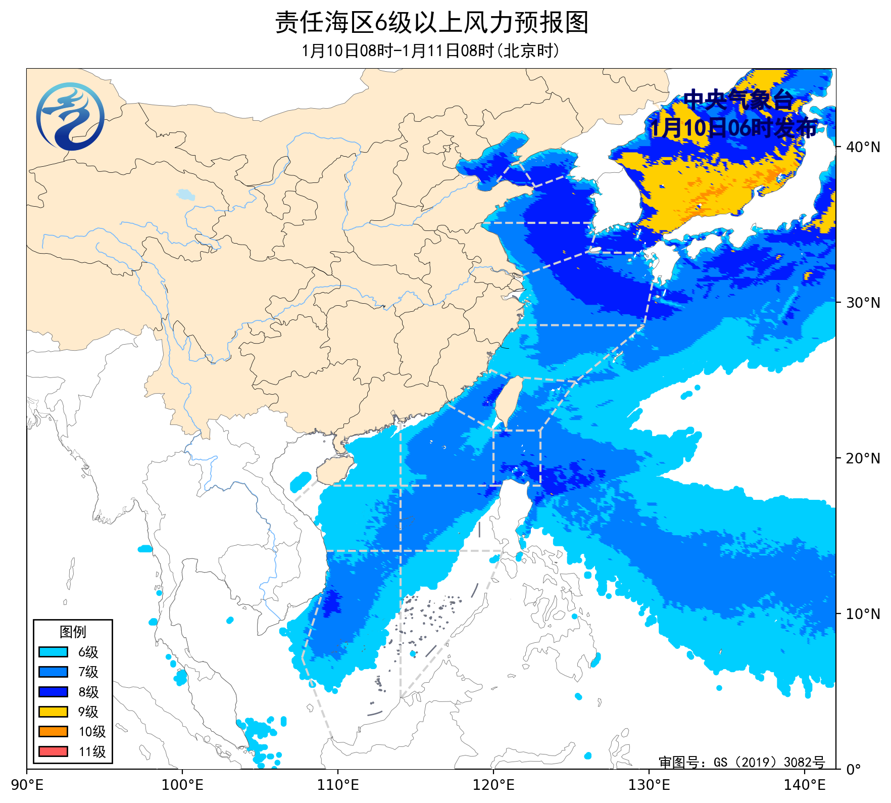 10日08时至11日08时,渤海、渤海海峡、黄海大部海域、东海大部海域、台湾海峡、台湾以东洋面、巴士海峡、南海东北部和中部海域、南海西南部海域将有7~8级、阵风9~10级的大风,南海西北部和南海东南部海域将有4~6级、阵风7级的东北风。