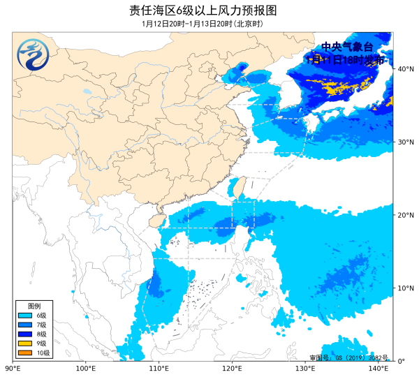 预计,1月14日夜间至1月17日夜间,渤海、渤海海峡、黄海大部海域、东海大部海域、台湾海峡、台湾以东洋面将有6~7级、阵风8级的风,巴士海峡将有7~8级、阵风9级的大风,南海大部海域将有6~8级、阵风9级的大风。