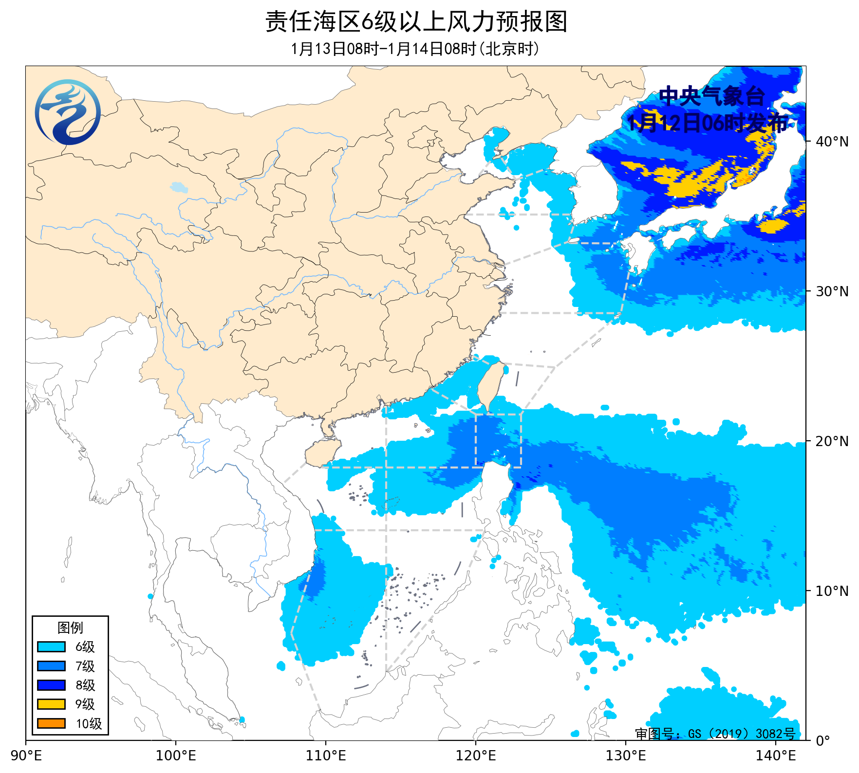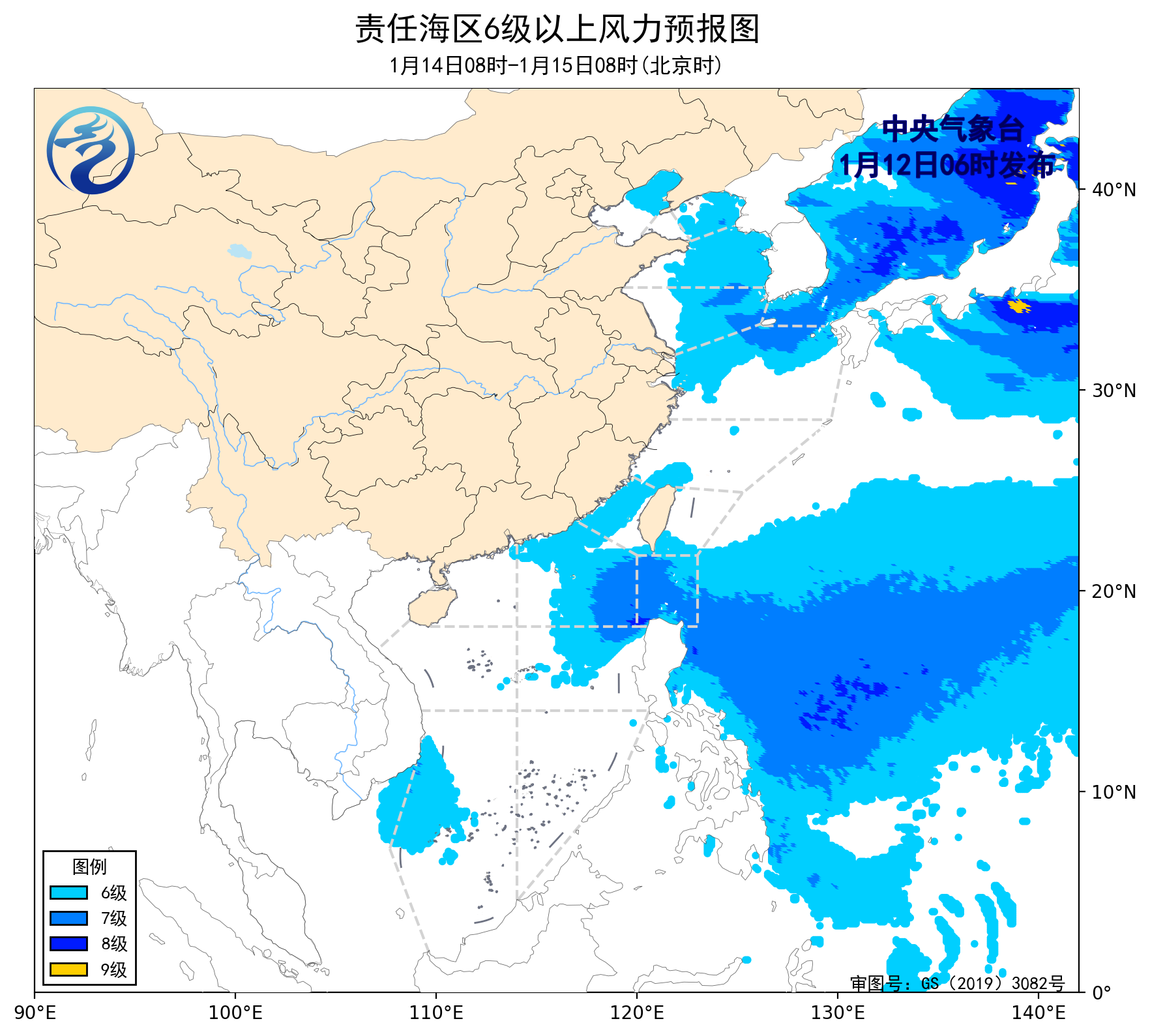 1月11日14时至12日02时,渤海出现了5~6级、阵风7级的东南风,黄海中部和南部海域、东海大部海域、南海南部海域出现了5~7级、阵风8级的偏北风或西北风,台湾海峡、台湾以东洋面、巴士海峡、南海东北部海域出现了6~8级、阵风9级的东北风或偏东风,南海中西部海域出现了5~6级、阵风7级的东北风。