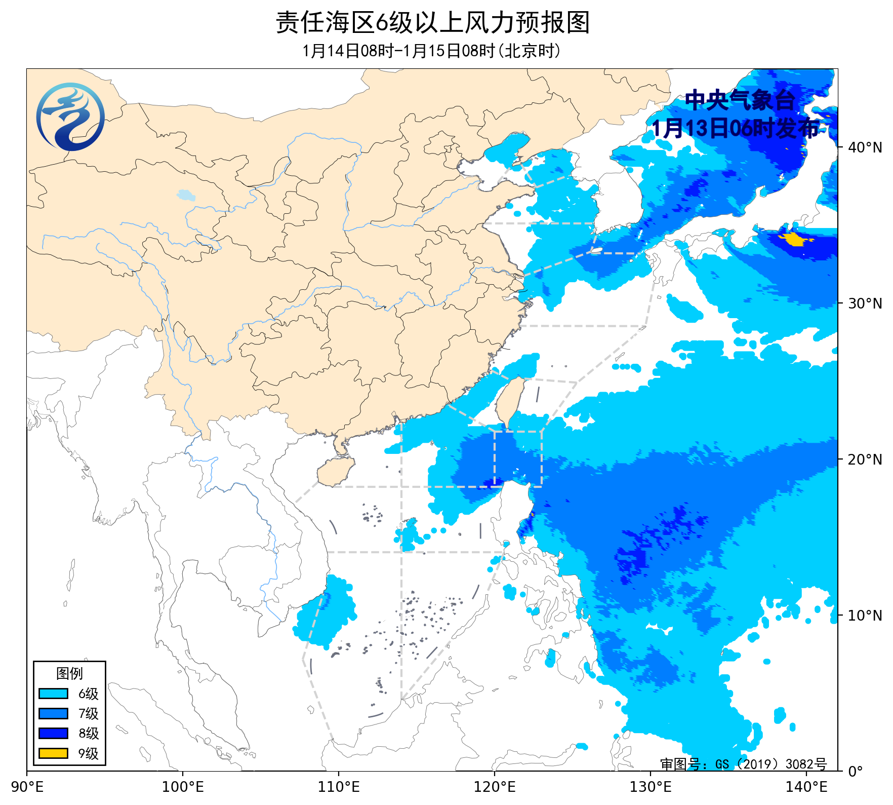 13日08时至14日08时,东海北部海域将有5~7级、阵风8级的西北风到偏北风,巴士海峡、南海东北部和中东部海域将有5~7级、阵风8级的偏东到东北风,渤海将有4~6级、阵风7级的偏东转偏南风,黄海北部和中部海域将有4~6级、阵风7级的西北风转偏南风,台湾海峡、台湾以东洋面、南海西南部海域将有5~6级、阵风7级的东北风。