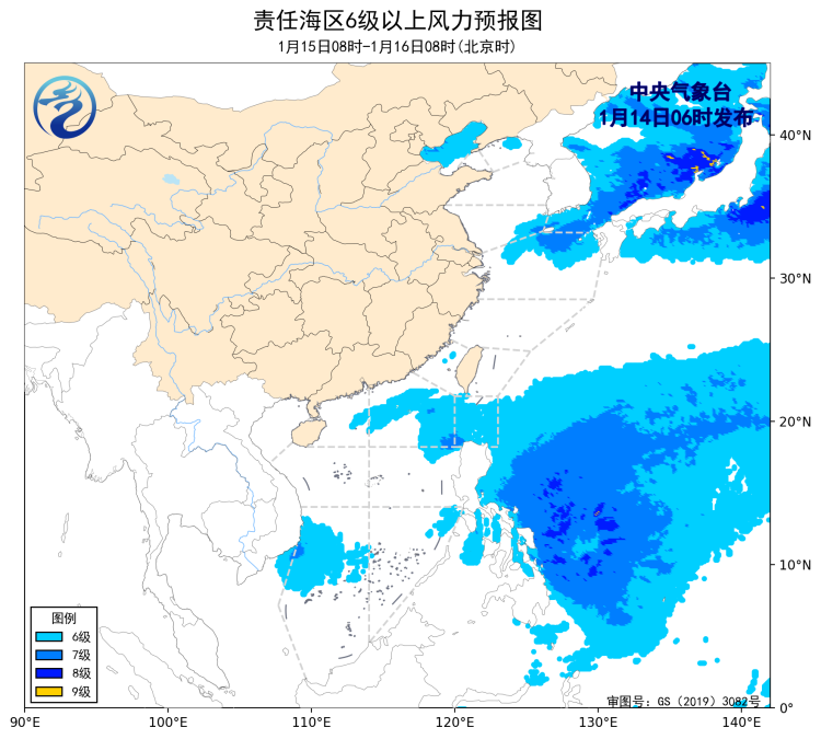 1月13日14时至14日02时,东海北部海域、巴士海峡、南海东北部海域、南海西南部海域出现了5~6级、阵风7级的偏北风或东北风。