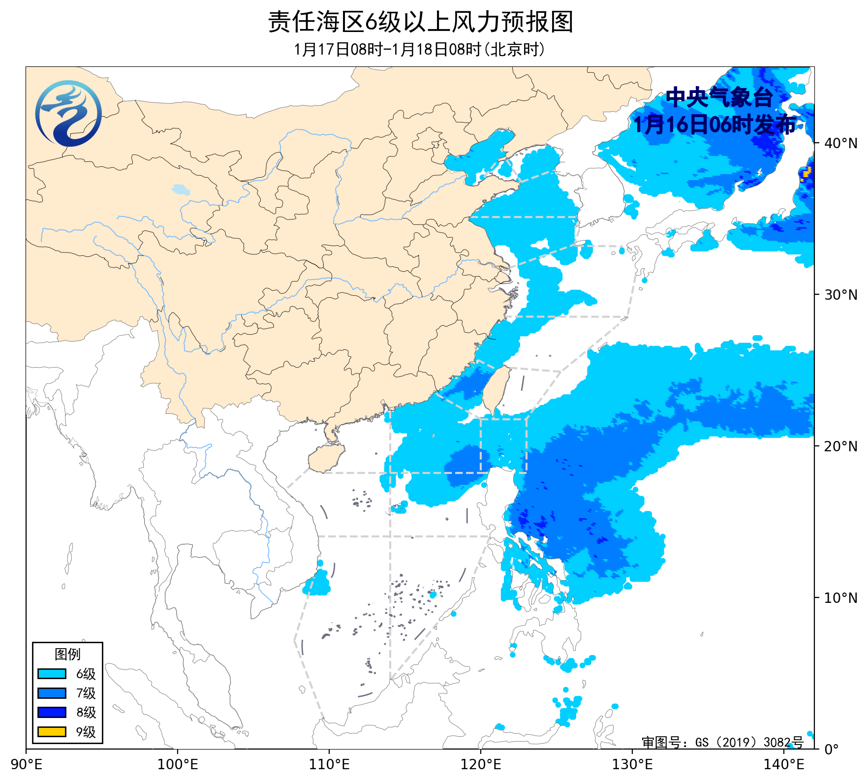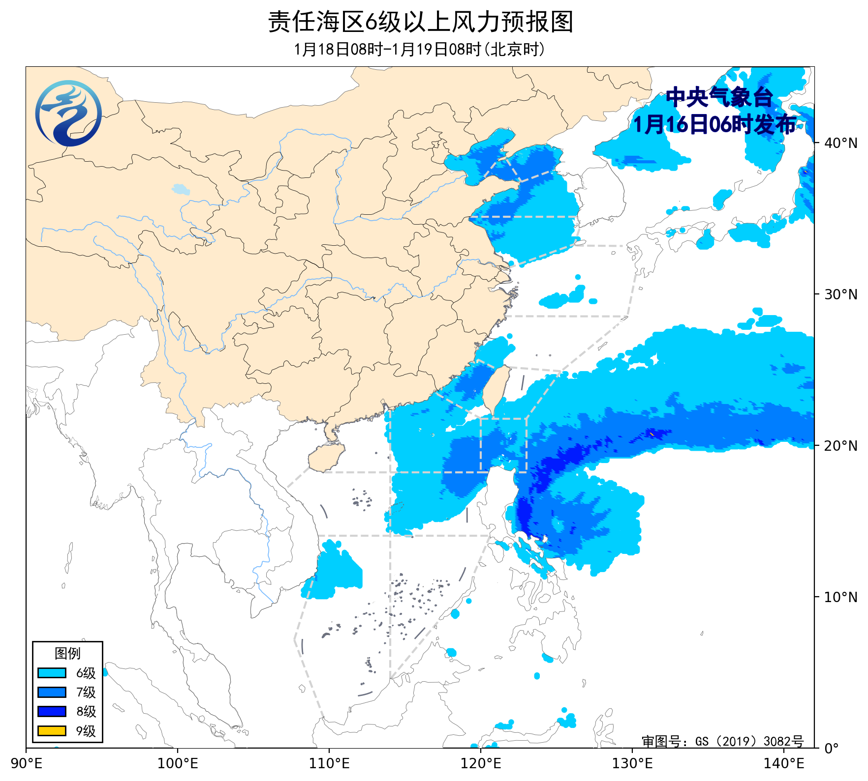 18日08时至19日08时,渤海、台湾海峡、巴士海峡、南海东北部和中东部海域将有5~7级、阵风8级的东北风,渤海海峡、黄海北部海域将有4~5级的偏北风增大到6~7级、阵风8级的东北风,黄海中部和南部海域、台湾以东洋面将有4~6级、阵风7级的偏北到东北风。