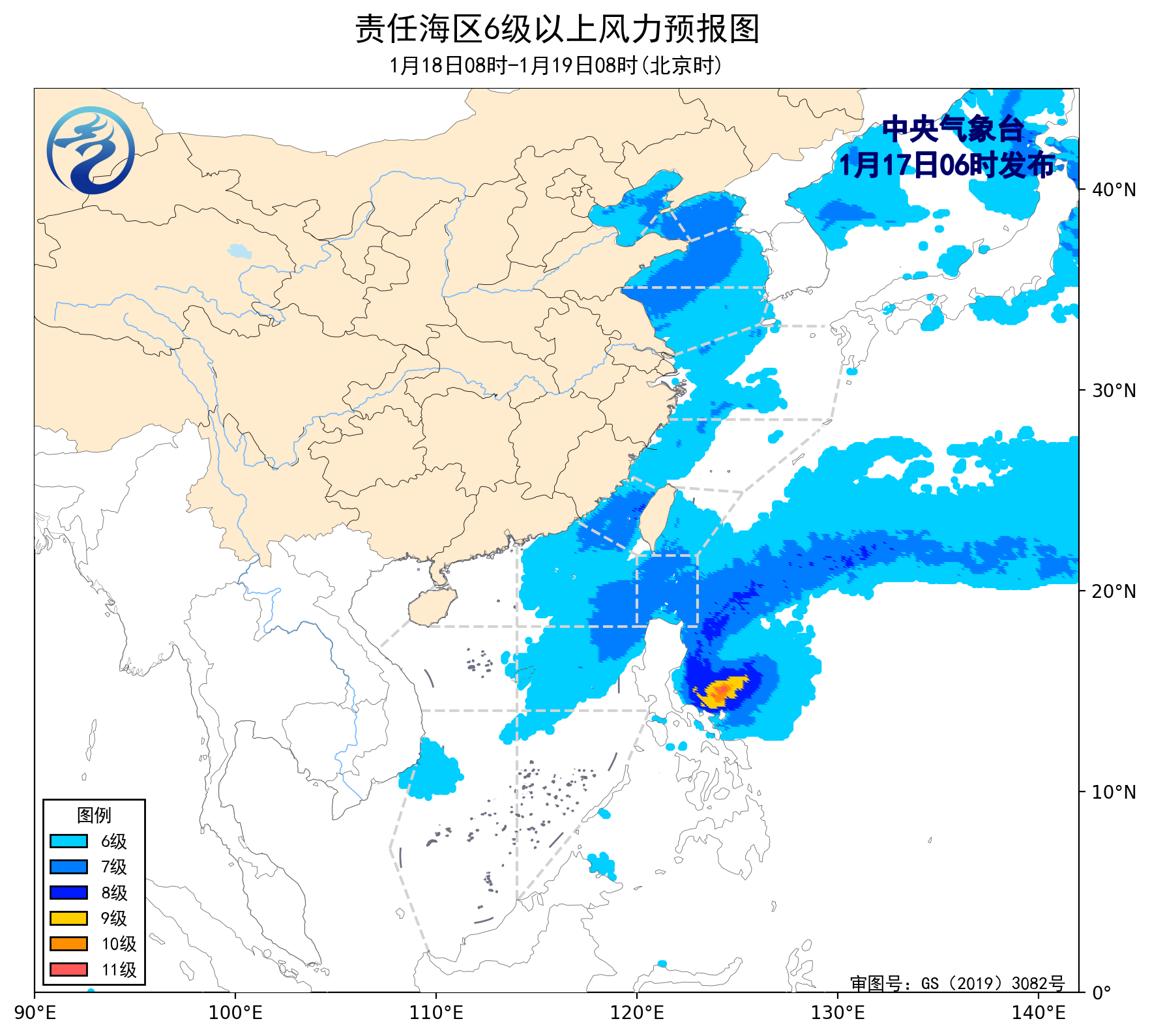 19日08时至20日08时,东海南部海域、台湾海峡将有6~8级、阵风9级的东北风,渤海海峡、黄海大部海域、东海北部海域、巴士海峡、南海东北部海域将有5~7级、阵风8级的偏北到东北风,渤海、台湾以东洋面、南海中东部海域将有5~6级、阵风7级的偏北到东北风,南海西北部海域将有4~6级、阵风7级的偏东风。