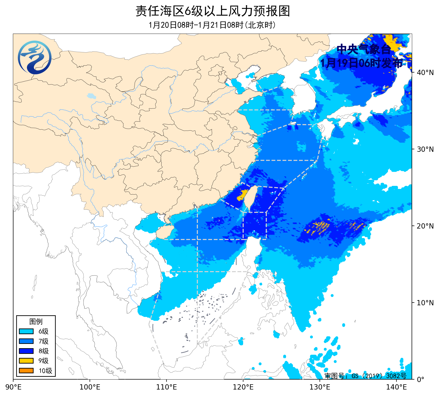 19日08时至20日08时,台湾海峡将有7~9级、阵风10级的东北风,东海南部海域将有7~8级、阵风9级的东北风,台湾以东洋面将有5~6级、阵风7级的东北风增大到7~8级、阵风9级的偏北风,渤海海峡、黄海大部海域、东海北部海域、巴士海峡、南海东北部海域将有5~7级、阵风8级的偏北到东北风,渤海、南海西北部海域将有4~6级、阵风7级的偏北到东北风。